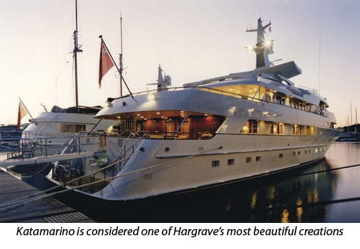 In 1991, Hargrave designed his largest yacht and one that has been called his most beautiful: the 184-foot Katamarino built by Amels. After a minor stroke, he scaled back his staff and took only clients or projects that he enjoyed. He claimed he was in “semi-retirement” because he no longer worked Sunday afternoons.