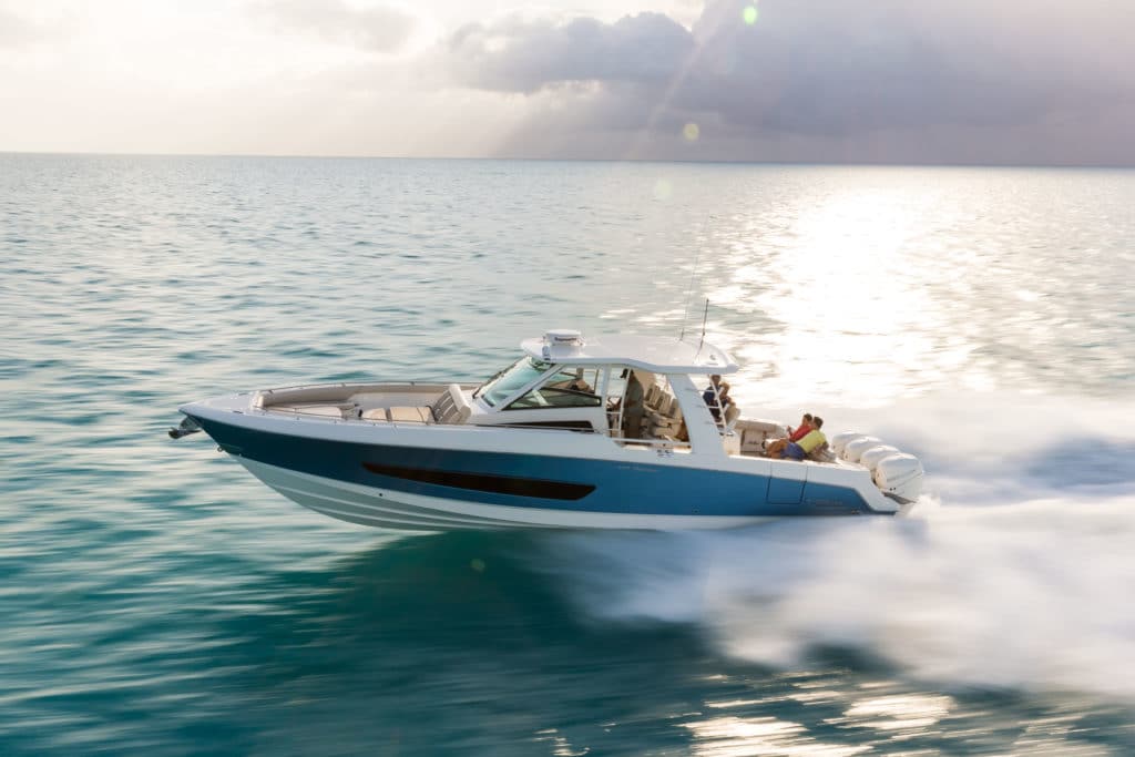 The 420 Outrage has wide side decks, a sturdy hardtop and a sleek helm. There is 7 feet of headroom inside the cabin, which also has eye-level windows. Quad 300-horsepower Mercury Verado outboards are standard, giving the 420 Outrage all the power necessary for long offshore runs.