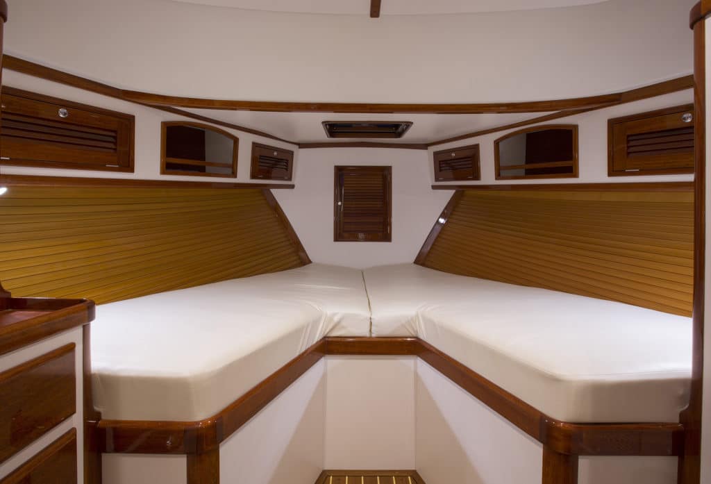 Anyone on galley duty during daylight hours will bask in natural light from the pilothouse’s windshield above. Alize‘s owners chose a V-berth for their stateroom, but a queen-size island is also available.