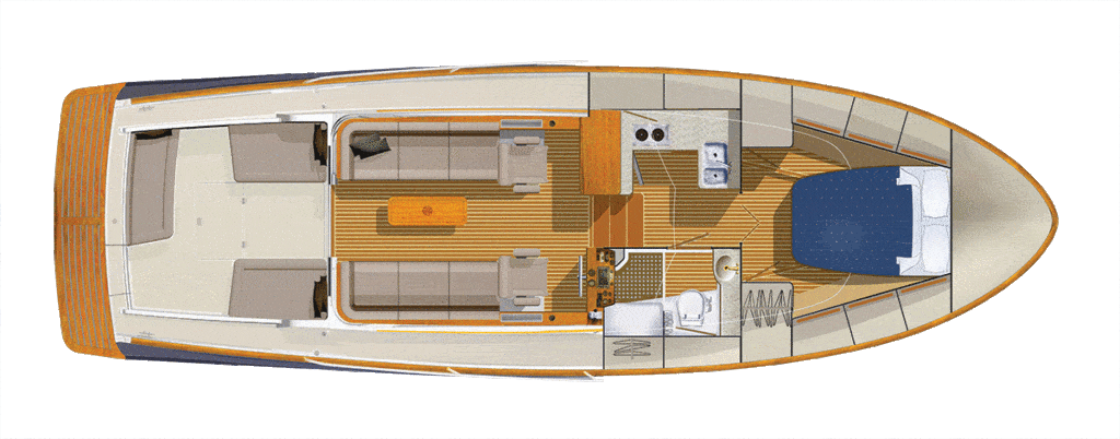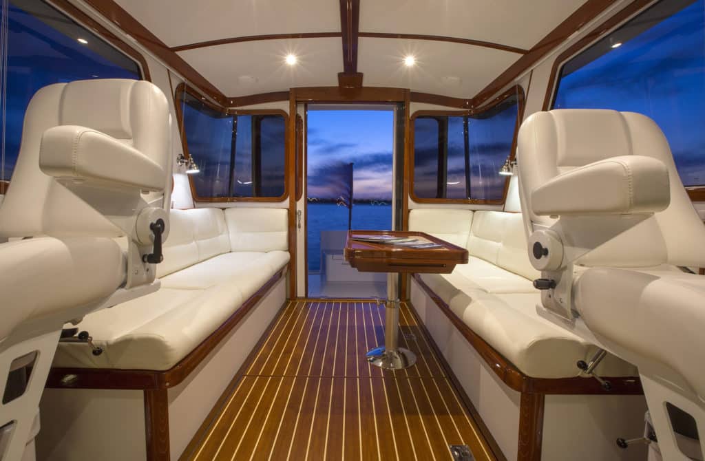 The symmetrical layout of the salon recalls those found on traditional sailboats. This couple plans to use this 40 called Alize V for daylong outings and overnighting, perhaps entertaining guests for cocktails, lunch or dinner, so the long settees — and a fold-out dining table on the port side — perfectly suit their purpose.
