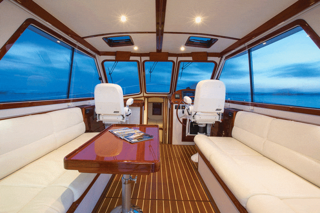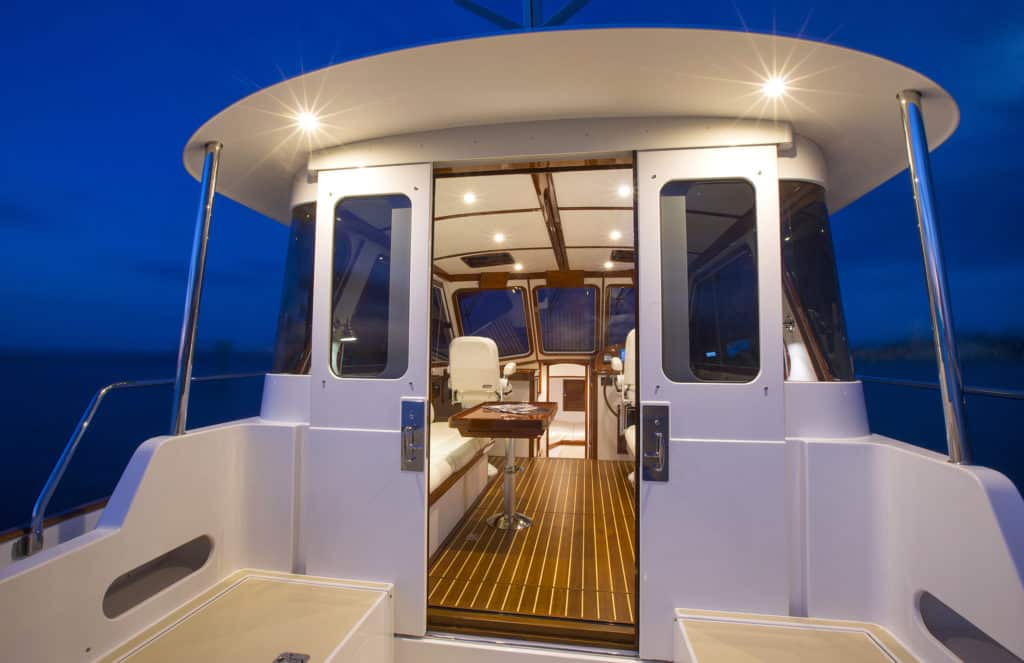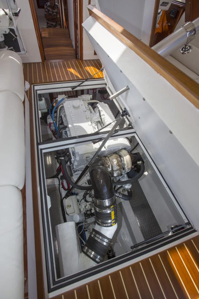 From a practical point of view, the tall house provides a lot of headroom in the salon and more than you’d imagine in the engine room located beneath. And the large windows provide super sight lines. The side windows slide open from their forward end. Hatches in the overhead help with ventilation, but when the weather turns hot and humid, the owners can engage the air-conditioner.