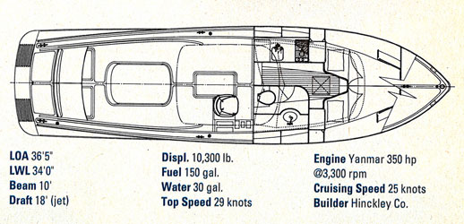 I still remember a run many years ago up through the sloughs of California’s Sacramento River delta in a metal-flake jet-drive hot rod. On luxury yachts, KaMeWa jet drives are considered the hottest propulsion units. But on mid-range boats, jets have never been widely used. I am going to go out on a limb and say that I predict this Hinckley powerboat will change a lot of thinking among traditional yachtsmen.