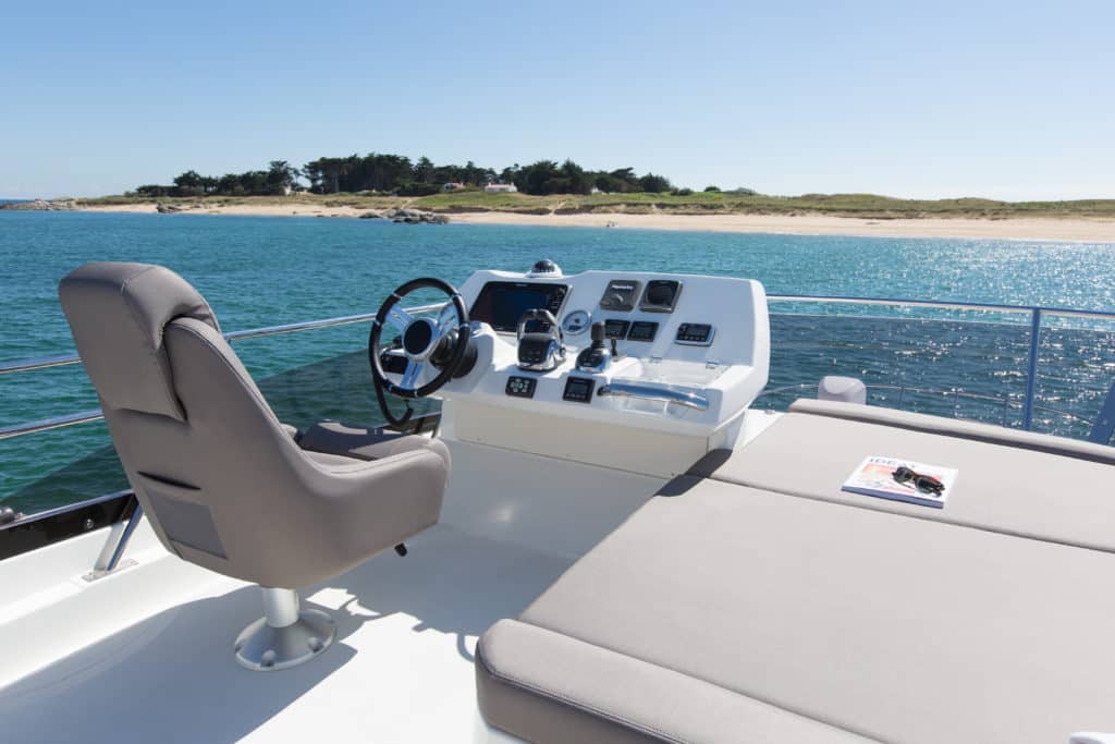 The helm is equipped with the owner’s choice of electronics, which, on our test boat, was a Raymarine package with a HybridTouch e125 monitor. Volvo Penta provided the digital monitors, shifters and a joystick by the single-wide helm seat.