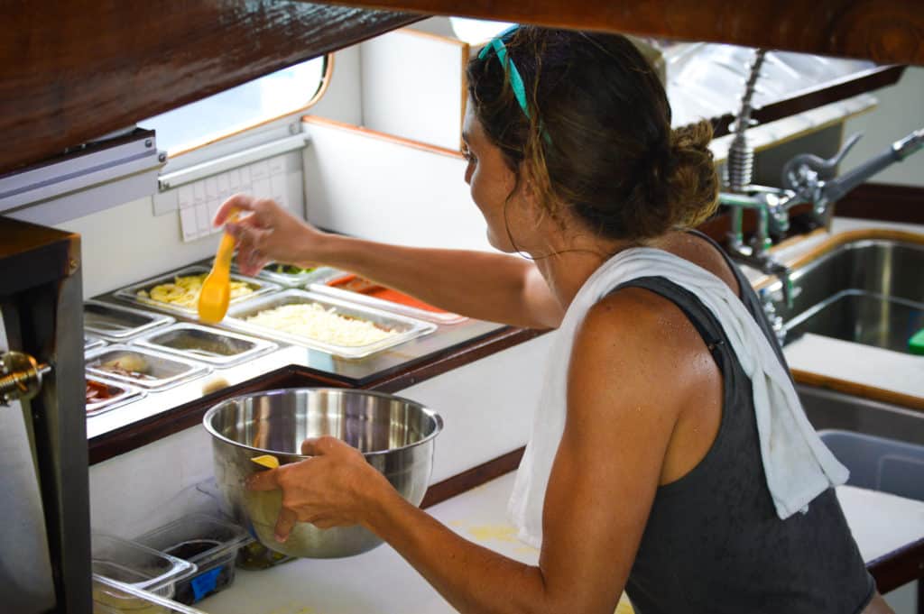 Running a food business out of a boat can’t be easy. You need good balance because of ferry wakes. Everything is always stowed, especially knives. If something falls, like oil, it rolls around and makes a huge mess.
