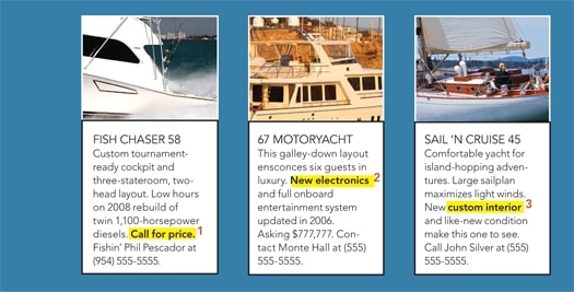 Ads hold plenty of information, if you know where to look, and they can chart the first leg of the voyage to your next yacht.
