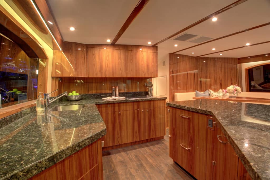 Entering the salon, I was impressed with the arrangement where seating abounds. An L-shaped settee sits across the aft bulkhead and up the starboard side, which has deep stowage underneath. There’s also a custom-beveled triangular coffee table and an end table just forward of it. A 40-inch TV, Bose V35 home theater, Blu-ray player and stereo add to the comfort value. To port, two fixed bar stools at the granite-top island make a great breakfast nook. The island doubles as a space for prep and for serving and dining, and it includes six undercounter Jenn-Air fridge/freezer drawers. It also creates a dogleg path through the galley with two entry and exit points.