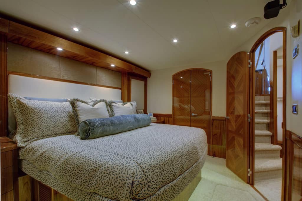 Hatteras used the small void between rooms to construct a locker that holds 14 rods (sans reels) and a separate washer/dryer closet. Aft and down three steps are the other two staterooms (ideal for crew) with direct access to the engine room. This is definitely a fishing boat, but don’t discount her ability to be a family cruiser too.
