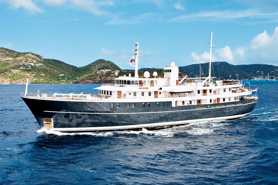 Sherakhan is a charter yacht that has always been beyond the norm. She launched in 2005 to great acclaim — a gorgeous, 228-foot yacht rebuilt from the remains of a dilapidated commercial ship. She was among the first crewed yachts to offer true-luxury accommodations for oversize groups, taking 26 guests during a time when it was virtually unheard of to welcome more than 12. Sherakhan‘s 18-person sun-deck hot tub fast became the stuff of legendary cocktail parties, and her two-story formal dining room remains among the most impressive spaces in yachting. Did I mention the onboard spa? She was one of the first charter yachts to have one of those too.