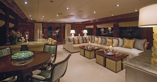 As interesting as the cabinetry are its contents. Denise Rich likes to entertain on a grand scale, so Lady Joy carries-neatly stacked in custom-fitted drawers and shelving-seven different sets of china and crystal for formal dining. The traditional dining room on the main deck seats 14 guests, but that’s just the beginning of Lady Joy’s entertainment area. Aft on the upper deck, alfresco dinners for up to 50 guests can be hosted at five tables, including the central table with four large removable leaves. Other tables and bars scattered around the yacht seat 12 on the main aft deck, 15 in the skylounge, 8 on the Portuguese bridge, and 23 on the top deck. All together, that’s a capacity of 122 guests seated for a meal at once, unheard of on a yacht this size, and perhaps without equal anywhere outside of a dinner-cruise boat.