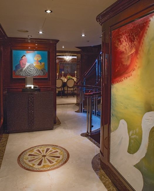 The dark-finished cherry interior, with traditional raised paneling and heavy molding, could lend itself to a subdued mood, but with Rich’s collection of colorful modern art, the spirit soars.The juxtaposition of the bright and sometimes-whimsical paintings against the formality of the cherry background works well in ways that are unexpected. A repeat yacht owner herself, Rich wisely realizes that Lady Joy is likely to have a new owner someday, so the cherry woodwork, the off-white carpets, and the ivory-toned upholstery and linens, create a neutral ground that will allow for changes in decor without expensive refit work.