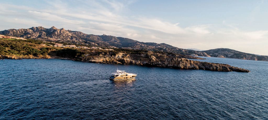 The Azimut Grande 27 Metri comes with twin 1,900 mhp MAN V-12s, 3-to-1 V-boxes and five-blade props. At half-load, and with those diesels spinning at their maximum 2,355 rpm, my test boat made an average top speed of 28 knots across several reciprocal runs — impressive achievement for 90-plus tons of yacht, and more than enough for our photographer, who asked us to slow down because we were leaving his drone behind.