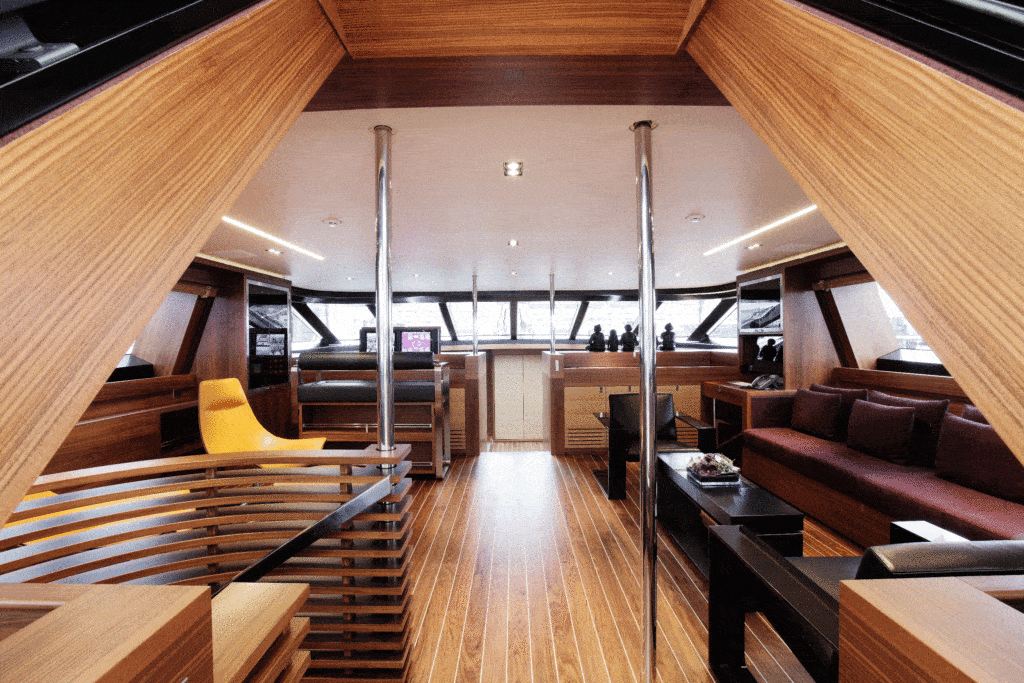 The salon resides amidships on two levels, with the upper carrying the larger area, including a helm to port and a navigation area across. Her lower level has a large dining area and a more intimate sitting area, and benefits greatly from the extreme rake of the windshield above creating a skylight effect.