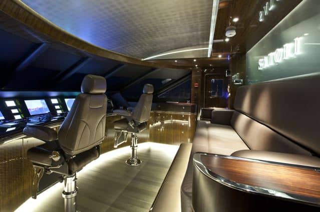 Similarly transformed from simple to sophisticated is the skylounge. As a customary upper salon, it features a circular coffee table accompanied by a large C-shape settee custom designed by Tessier. To more readily switch to lounge mode, the leather-clad settee splits into three individual ones, which can be repositioned in a variety of ways. Guests can take in the views through the sole-to-overhead windows aft and to each side, or they can face the onyx-top bar forward. Just like the bar on the main deck, the onyx is additionally backlit with LEDs that change color, making the room more of a mod floating club. Curved ebony screens slide quietly across the full-height windows when the occupants want privacy. When moved into place, they strike a strong contrast against interspersed palladium-leaf panels. A little extra visual stimulation comes courtesy of a magic mirror television. Only when the screen is on do you realize the television is housed behind a reflective wall surface, a treatment that’s increasingly popular on many megayachts these days.