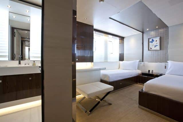 As sophisticated as the decorative palette is, the open plan of the master suite brings back Satori‘s casual nature. The arrangement is quite a change from Heesen’s other deliveries — and most other builders’ megayachts, whether custom or not. Rather than have the en suite bath, study and sleeping area as individual rooms, they’re all visible to one another. A 46-inch TV acts as a partial partition between the stateroom and bath, rising from cabinetry. Concealed sliding doors take care of the rest.