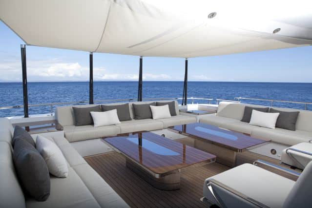 Heesen’s design work is also evident in the nearly 754-square-foot sun deck. A virtual beach club suspended above the sea, it has a Jacuzzi tub forward (though custom designed to sit lower, since the owner didn’t want its edges interrupting the sleek profile of Satori), with plentiful sun pads around it. More sunning space is fully aft, purposely occupying nearly the entire beam. Alfresco dining and cocktails can be enjoyed in the shade of the radar arch, with a convenient cooking area for the crew.