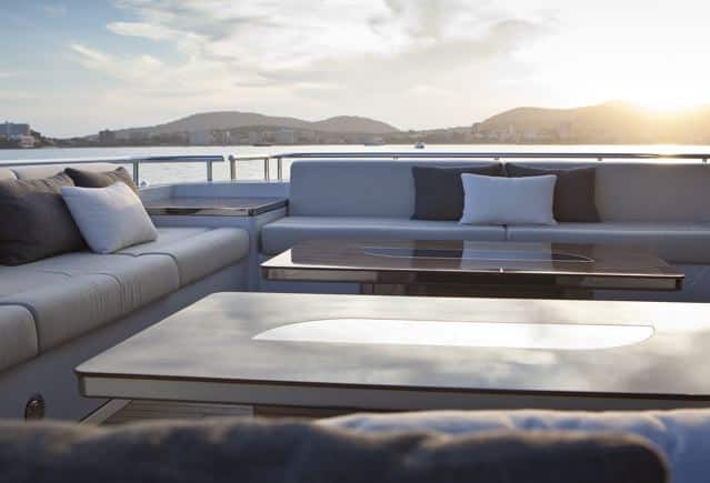 A good example is the master suite. Forward on the main deck, it contains low furnishings, like other areas aboard, to emphasize the sense of space. To enhance this feeling, the owner and Tessier selected polished steel, palladium leaf and mirrored panels to reflect the sunlight streaming in through the windows. The builder says the materials posed a challenge, but to see the result, you’d never know. In combination with the natural tones of the rest of the room’s décor, they create a soothing, sensory experience.
