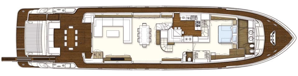 So how did Ferretti figure out how to use MCA regulations to get several of the hottest megayacht feature trends, including this yacht’s teak beach club with separate tender stowage, into a 96-foot yacht without adding a lot of expense to the construction cost? For the 960, this Italian builder took its 881’s proven hull, which measured around 88 feet in length overall and qualified as a 24-meter vessel, and added about 9 feet to the stern behind the transom. Presto, you have a 96-footer that measures as an 80-footer.Courtesy Ferretti