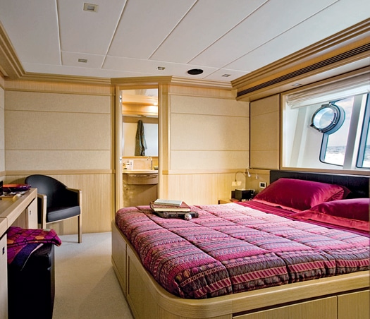 A spiral stair leads down to the guest suites, where you have the option of a three- or four-cabin layout. We had the three-stateroom option on the test yacht: The VIP suite is a full-width stateroom combined with a twin and a double cabin. (On the four-stateroom option what would be the VIP space becomes two double cabins.) The main deck level master suite has wonderful light from the large side windows; you can wake up with a panoramic view, no rocking, and swaddled in luxury. For instance, the bathroom is one of the best. I’ve seen, designed for two people with twin wash basins and a double shower. The light oak used in the suite extends into the bathroom décor, matched up to marble tops.