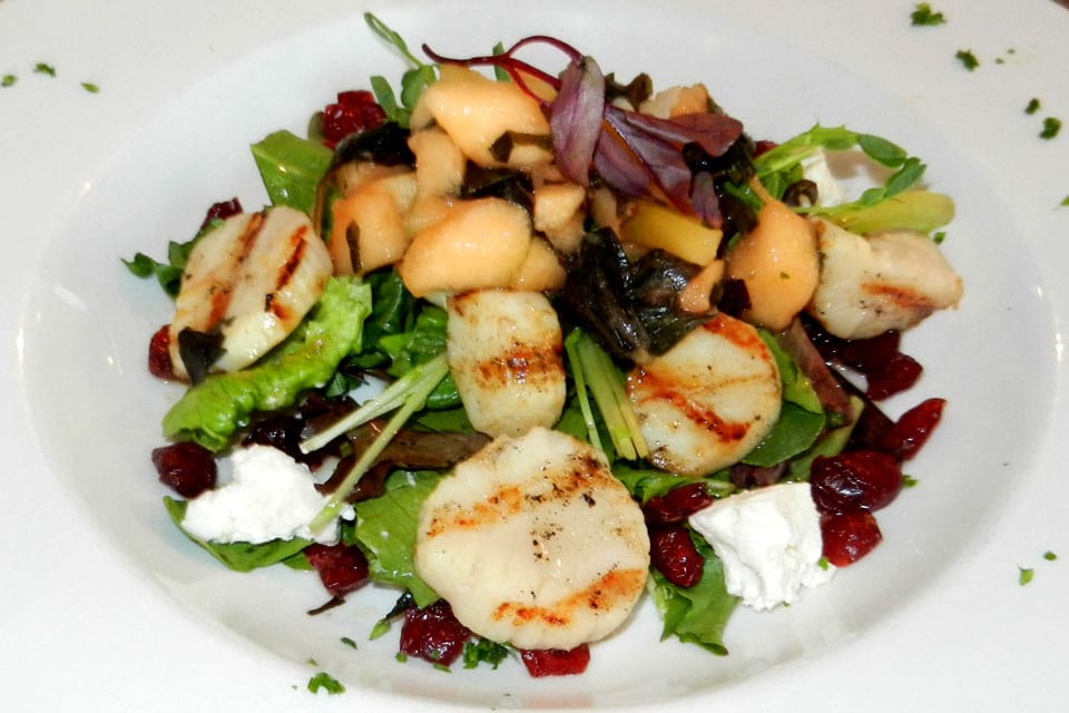 roasted eggplant puree. zucchini pearls . chic pea croquette. greek yogurt emulsion 33.95 pepper-crusted new england scallops