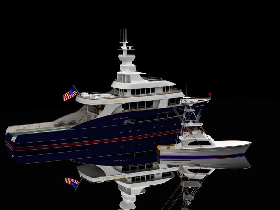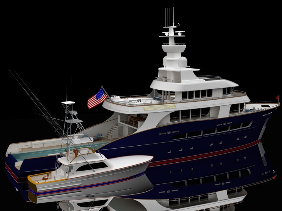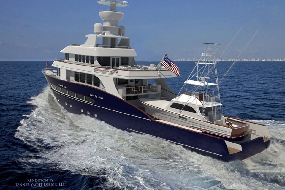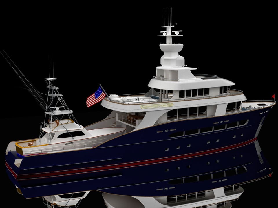 All kidding aside, the Explorer 130 is an imposing vessel, which fits beautifully with her purpose. Designed by Erwin Gerards of EG Designs, with concept by Mike Matlack of Gamefisherman Inc., this yacht will carry a crowd of offshore fishing enthusiasts and their families across oceans in search of the ultimate catch. Like other ships, the Gamefisherman rides on a pure displacement bottom, shaped to carry a heavy payload and still be easily driven.