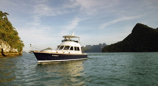 It was just before midnight, and we were somewhere off the coast of Langkawi, on the border of Malaysia and Thailand, speeding toward an island anchorage at 20 knots on a gorgeous, blue-hulled Grand Banks Eastbay 47. The water was flat, and on the bridge the tropic air was warm and soothing. An umbrella of stars covered us, there were millions and millions of them, more than I’ve ever seen before, and they seemed so close that we could almost reach out and touch them. It was one of those magical moments when the water and the sky blended seamlessly into one universe; we couldn’t tell where one ended and the other began. We sped on through the night, as if suspended in time and space.