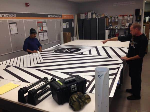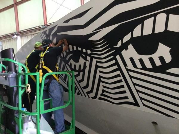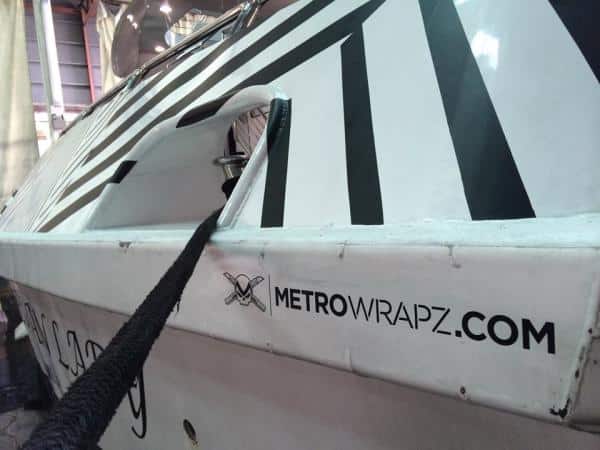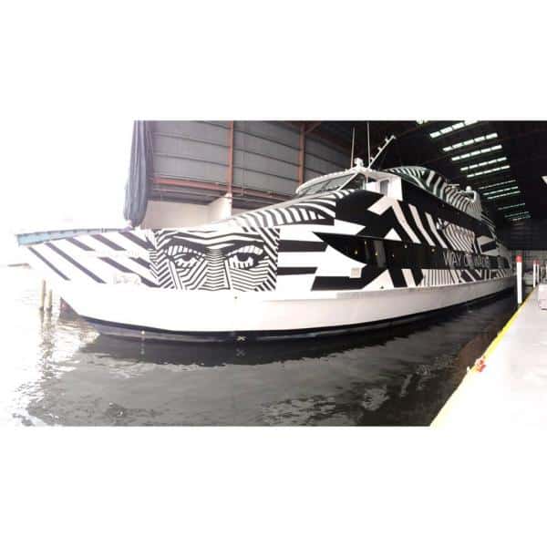 Both Simpson and Dede say Wade’s event charter was put together quickly, with the graphics moving from conception through design to installation inside of a week. The actual installation process took 10 people 24 work hours to complete, Dede says. His company creates the wrapping material in-house, then affixes it to the yacht using a 3M film whose edges are sealed, keeping it attached even while the yacht is under way yet still making it removable with about a day’s work by a half-dozen people. According to Dede, the process leaves no lasting effects on the yacht’s exterior paint job.
