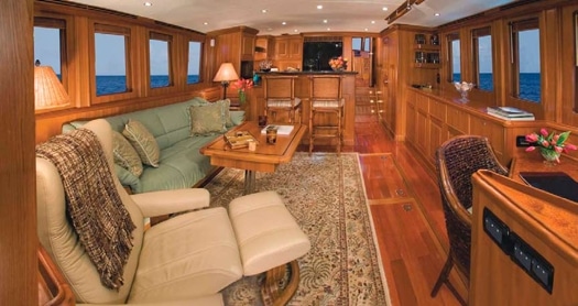 Having a canoe stern cuts down on the after deck, but there are a pair of settees with tables, separated by a dogging centerline transom door to the swim platform. Inside the salon, Koethe opted for a desk in the after starboard corner and, if you have to work aboard, this is a pleasant spot with a good view and space for a computer and papers. He also chose loose furniture-a couch and lounge chair-rather than builtins. While a number of woods are available, the Koethes picked a tightly grained teak that has a yachty look.