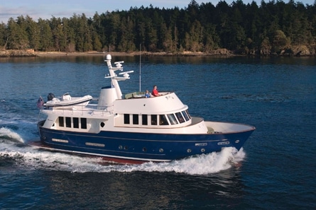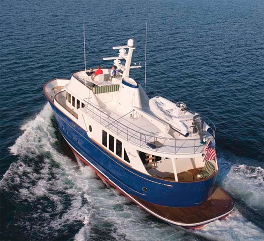 Her tradename aside, this is a passagemaker. S&S created a hull much like a sailboat, with a long keel and a bulbous bow that increases the hull speed. With a husky shoe on the full-length keel to protect both the prop and the rudder, the 60 is ready for adventure.