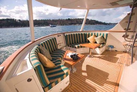 Easy stairs lead from the pilothouse to the bridge which is well forward. A pair of helm chairs are behind a fiberglass dash that duplicates the lower helm in electronics, and an L-shaped settee adjacent to a wet bar completes the bridge. That yachty funnel hides a pullout Vermont Castings barbecue. The electronics mast is hinged so Koethe has the 20-foot clearance needed to transit the Erie Canal.