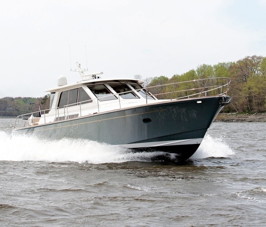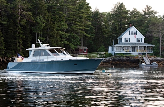 Whistler’s owner, an artist who lives on the Maine coast, commissioned the design and construction of Whistler. The idea was to replace Annie Rose, a 38-foot single-engine jet boat built by Lyman- Morse in 2004 and 2005 (see “On Board: Red Topsides in Morning Sun,” October 2005). Although the owner and his wife loved the boat, they wanted more speed and a larger interior to enjoy longer cruises than had been their custom.