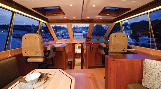 A veritable deluge of natural light washes Whistler’s pilothouse and, five steps down and forward, the galley and study. The house has large windows all around, giving its occupants excellent sightlines in every direction. The steeply raked windshield, which sprouts from the trunk cabin over the bulkhead between the master stateroom and the galley/study, is indeed a generous skylight. Even on cloudy days, the accommodations abaft the owner’s stateroom will be bright.