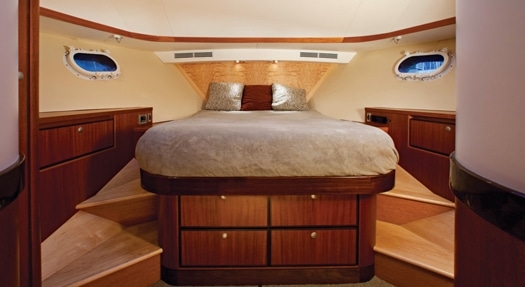 I officially met Whistler on another morning and discovered that the masculine persona is echoed in the authoritative voice of its Cat C18 diesels, absence of furbelow inside and out, upright superstructure, and traditional arrangement plan. Anyone who likes curving Euro-style design, may find Whistler’s interior a bit stark. Same goes for the exterior styling, but no one can deride this yacht’s excellent proportions and intelligent use of space. The latter owes a debt to straight lines and right angles. Obtuse angles and excessive curves in the relatively confined interior of a 55-foot express yacht use up more area than their artistry justifies.