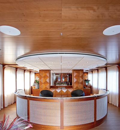 The owner’s stateroom, forward on the main deck, holds more surprises. Entering the room from the main foyer, a large white-painted recess inboard provides space for an objet d’art or two, and outboard, a private sitting area that, reminiscent of early sailing ships, includes a hammock slung in the corner. At the forward end of the stateroom, under the brow and down three steps, is the master bath area. Above the tub, a row of windows, translucent to obscure the view from the foredeck, bring an incredible amount of natural light into both the bath and the remainder of the stateroom.