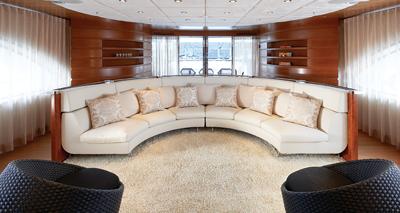 Every square inch aboard a yacht is valuable real estate, and most owners don’t want to “waste” the space by leaving it open. Northlander is different, and the result is an exceptionally serene atmosphere. A curved settee and two chairs, all on an area carpet toward the center of the saloon, create an intimate seating area conducive to conversation with friends and family. It also allows space outboard of the seating, so other guests can pass through the room without disturbing those already seated there.