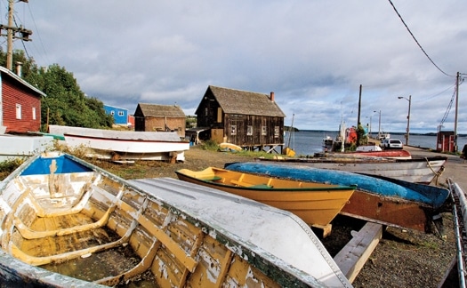 Not far from Cape George, Conklin spotted a pod of pilot whales among the white caps on our starboard side. Pilot whales are relatively small, but that didn’t detract from our thrill of being within several meters of them and hearing them blow. Soon, we rounded the cape and slipped into its lee. The seas calmed, giving us a smooth and carefree run to the riprap breakwater that marks the entrance to the harbor at Ballantyne’s Cove. This tiny harbor offered only a fishand- chips shop and a modest museum devoted to swordfishing, but it was safe from rolling seas and promised a quiet night.