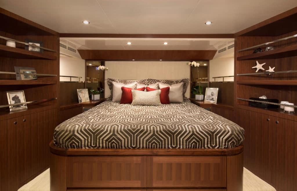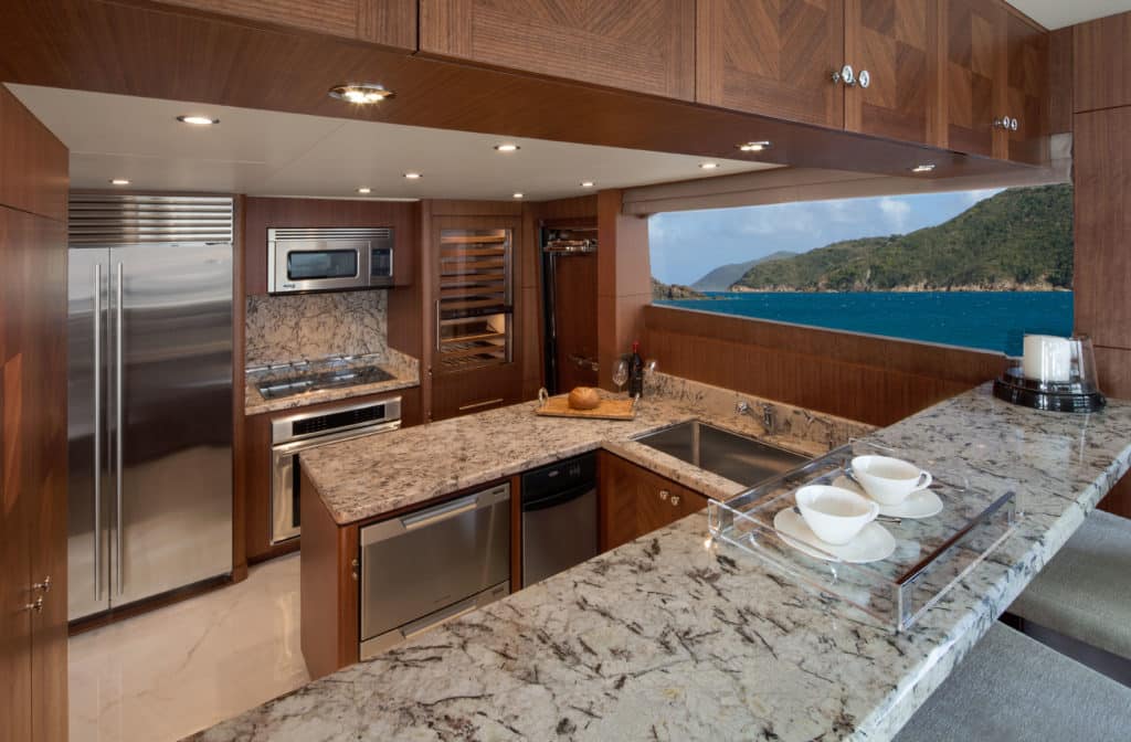 Another feature of designed-in form and function is the galley. A U-shaped layout is typical, but add the aft bulkhead separated by a walkway aisle and a forward breakfast nook, and you’ve maximized the usage while minimizing required real estate. Along the aft bulkhead are the full-height, side-by-side Sub-Zero fridge and freezer next to a Thermador range and Viking microwave, all in their own cove next to the wine cooler. The chef can stand at the stove, cook the meal and rotate to plate the food, which is then whisked to the dining room. Service to the aft deck is via the portside door and down the full side deck, keeping the feeding operation out of the owner and guest space. Cleanup is just as easy thanks to acres of counter space, a ­Franke sink and Fisher & Paykel dishwasher drawers.