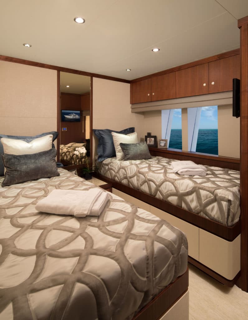 The OA100 has four staterooms belowdecks and carries the wood and stone finish throughout. Amidships is a full-beam (23-foot) master with hull-side windows, his and her heads with ­central shower, a 50-inch LCD TV, a king-size berth and walk-in closets. On either side of the forward companionway are guest staterooms with en suite heads and twin berths. The forepeak VIP has an en suite head and queen berth. All heads incorporate the builder’s proprietary Crystal Shower, with superior transparency crystal-clear glass doors.