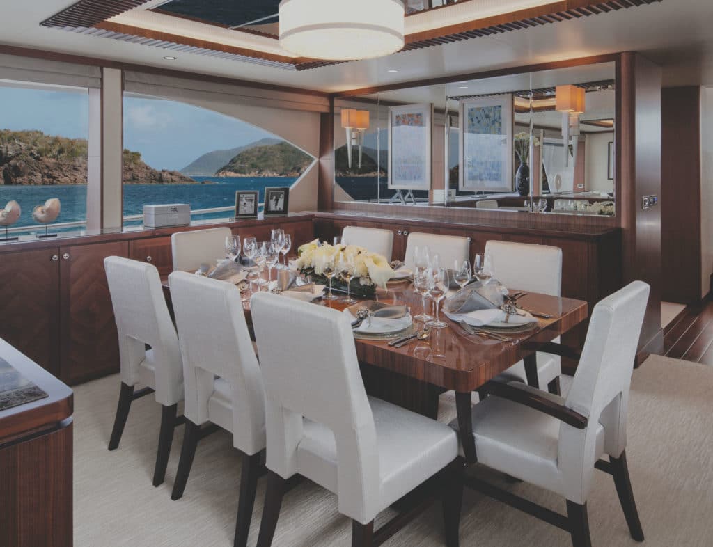 Inside, the open layout is striking with the salon’s large panoramic side windows and low-­profile furnishings. Salon seating is a U-shaped settee to port and twin barrel chairs with center wood coffee table. Forward is a formal dining table with service for eight. Dividing the salon from the dining area is a low credenza, which follows the height requirements of the dining chairs, starboard cabinetry and all furnishings; doesn’t impede the flow of ambient lighting; and keeps the view open.