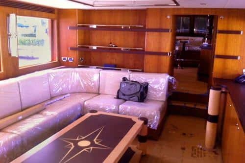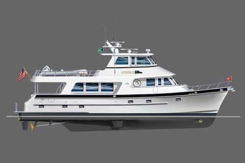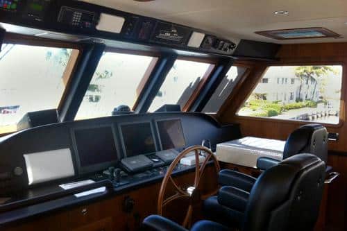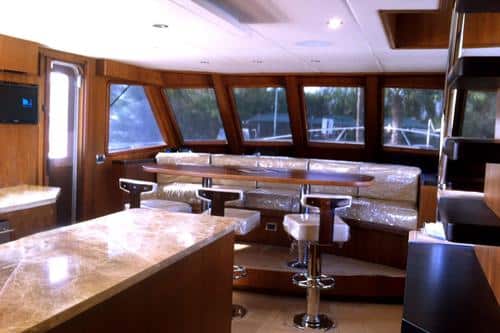 In lieu of setting the yacht’s pilothouse forward, this space was used for a sizable country kitchen/galley setup. While this layout may be a bit out of the ordinary, it works, incorporating a full island and settee. The fully-enclosed pilothouse is set above for maximum visibility. Look for her at the Miami Yacht & Brokerage Show.