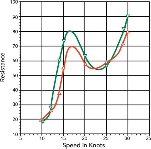 In past columns, I referred to the “hump” region, a range of speeds to avoid when selecting a cruising speed for your boat. I’ve received e-mails from some of you that tell me you’re cruising in that range unknowingly or are stuck there on boats that are underpowered, overweight, or out of trim. The graph on this page, for an 80-foot power catamaran in two different loading conditions, clearly illustrates the problem. The resistance of the boat (which corresponds to required horsepower) peaks at some early point, drops off, and then climbs again.
