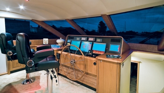 Underlining the thoughtful outfitting of the 85 is the lower helm, which has an electronics package that includes a Nobeltec Visual Navigation Suite (VNS) Max Pro with C-Map charts, XM Weather overlay, Furuno NavNet 3D chart plotter, and color sounder, all displayed on 19-inch NEC LCD displays. Naiad Multisea II stabilizers are standard, as is a 38-horsepower Naiad bow thruster. The Furuno system also includes a 72-mile digital HD radar, and other electronics include a Simrad autopilot and Icom VHF.