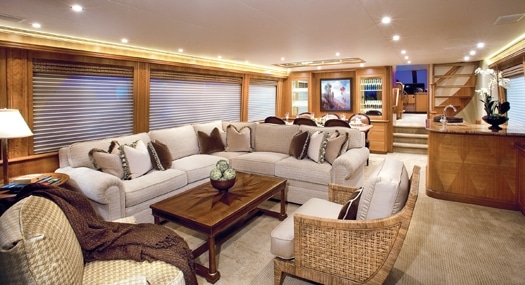 One area that benefits from the new superstructure molds is the bridge, which is both wider and longer than before. This width allows a 16-foot tender to be carried athwartships on the now-extended boat deck, giving more room for sun lounges or water toys. All can be launched with the hydraulic Nautical Structures 1,700-pound davit.