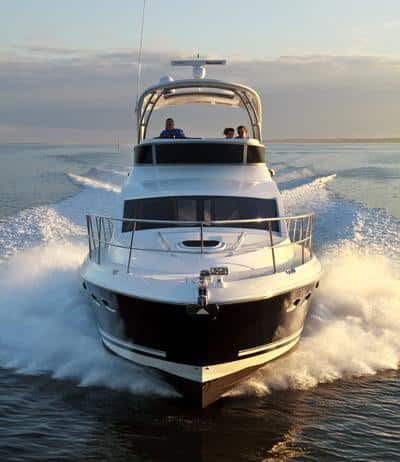 Sea Ray’s new 450 Sedan Bridge features a two-stateroom, two-head layout — with the optional convertible settee in the salon, she can comfortably sleep six overnight. Her twin 480-horsepower Cummins MerCruiser diesels with Zeus pod drives provide turn-on-a-dime maneuverability, and in preliminary company sea trials, propelled the 450 to a top speed just north of 30 knots. At 1500 rpm and a comfortable 8.5 knots she has a cruising range of around 400 miles. The flybridge has a U-shaped settee with a table and a refrigerator, inviting company for the helmsman while underway. A hardtop comes standard with an optional electrically activated retractable canvas roof. A lower helm station is a smart option for foul-weather cruising. For more on the 450 visit www.searay.com.