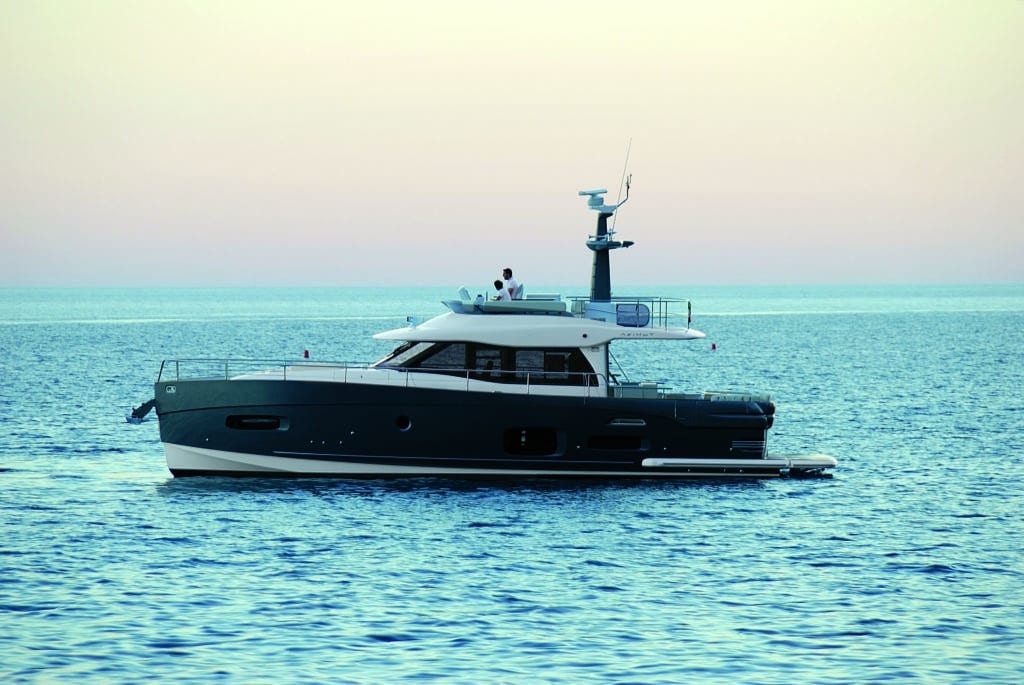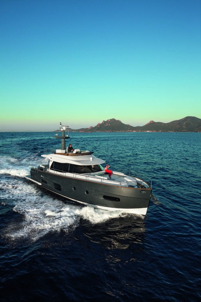 Her sea trial revealed that the 53 has a mini-explorer’s DNA at her core. The Golfe de la Napoule off Cannes, France, was running a mere 1 to 2 feet, but we were able to get a taste of how the 53 should perform. The day was warm, so I drove from the flybridge where I could spot low-lying sea kayaks and other small boats with ease. This yacht’s starboard-side helm offers unobstructed visibility in all directions, and the helm console includes a Raymarine eSeries display, Raymarine VHF, oversize sailboat-style steering wheel and, on the right, throttles for the 500-horsepower Cummins diesels and Xenta joystick for tight- quarters maneuvering.