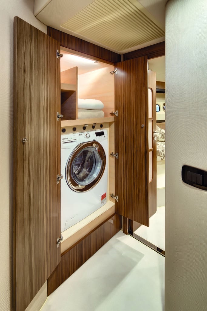 Six 24-inch-wide steps bring you below to an atrium and a nice view up through the windshield. Azimut made good use of available space on the lower deck, designing three staterooms and the fourth area for stowage. The unit has built-in okume-wood shelves, left unfinished as part of the rustic nature of the boat, Lantero says. Owners can choose to finish the wood and use the space as a fourth stateroom. On my 53, there was a washer/dryer in this area.
