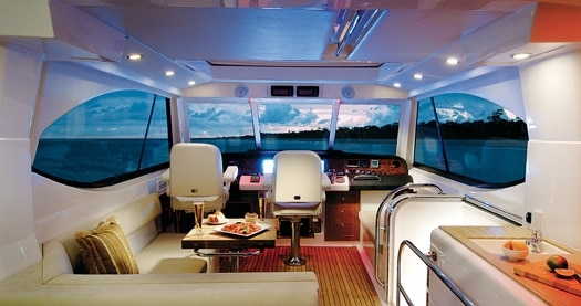 From the outside the 58 follows the same creative path as the other semi-enclosed bridge models in the Riviera line. It is not easy penning a good looking convertible that’s less than 70 feet without having it appear top-heavy. Riviera’s design team has done a good job of diminishing this with a silky smooth unbroken sheer sweep that visually adds to her length. This effect is embellished by the 58’s long, slim window line and blacked-out house face. Like her smaller sisters (47E and 51E), her bridge is semi-enclosed with the after end fitted with isinglass. On inclement days one can ride in climate controlled comfort and, if the weather improves, drop the curtains, open the side windows, and retract the electrically operated sunroof. Those that find an enclosed bridge too confining should take a close look at this arrangement because it offers an interesting indoor-outdoor alternative.