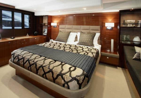 The master stateroom spans the full beam amidships, with a stylish padded headboard for the king-size centerline berth and huge ports that provide a view of the surroundings. A note on these ports: Rather than the usual separately fitted panes used on many yachts, Princess uses a massive single frame with its own mullions, recessed in the hull side for protection.