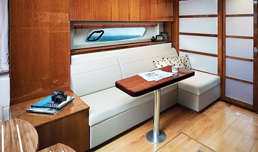 The owner’s cabin fills the bow with a fullsized berth with an electrically actuated extension- it actually retracts to provide more cabin space for dressing. Even better, it has a Posturepedic electric backrest so you can watch the 19-inch flatscreen TV comfortably. The berth also hinges up to reveal a cavernous stowage area, and the cabin has a pair of cedar-lined hanging lockers, built-in nightstand drawers, and overhead lockers on each side. Two oversized ports give a picture-window view of the outside world, making this a great place to wake up.