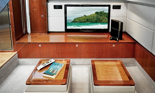 But that’s only part of the story. In my mind, the most important feature for the 450 Sundancer is something you don’t often see on yachts under 100 feet: A media room. That’s right, the 450 has a dedicated media room just abaft the salon, complete with a comfy UltraLeather settee and a 37-inch flatscreen TV with a DVD player and gaming system port. Satellite TV and surround-sound are available upgrades. A pair of movable ottomans have dual-purpose tops: Flip over the padded cushions and they become cocktail tables for drinks and popcorn for the movie. The room even has blue lighting for a theatrical effect.