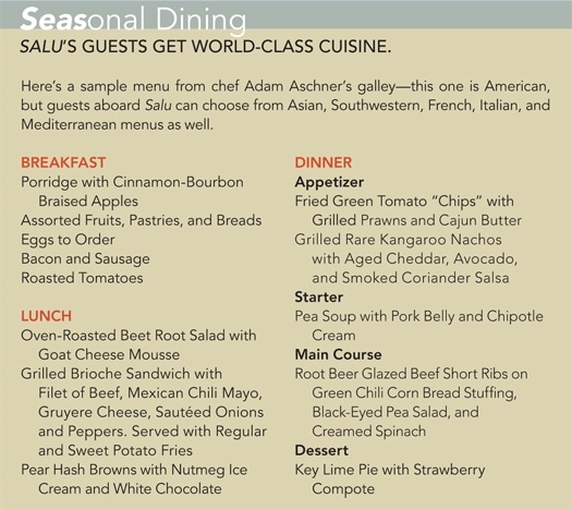 That includes chef Adam Aschner, who was born and raised in Dallas, Texas, and who reportedly makes some of the meanest chicken wings on the water. Southwestern cuisine is his specialty, particularly bold flavors such as smoked bacon, chipotle peppers, and Mexican chocolate. He’s also a trained sushi chef who, at the time of my visit, had just returned from Chinese cooking classes in Hong Kong.